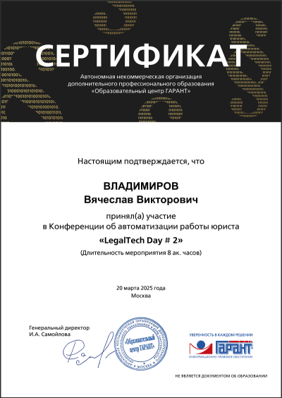 Благодаря опыту работы в государственных органах, обладаю необходимыми навыками и знаниями для эффективного решения задач в различных сферах права..